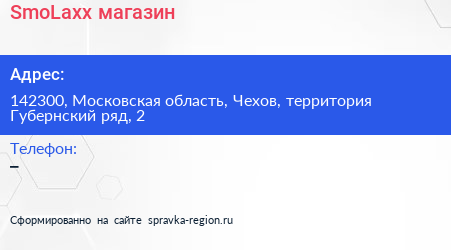 SmoLaxx, магазин по адресу 142300, Московская область, Чехов, территория Губернский ряд, 2 в дальнейшем Организация, размещена в следующих категориях: