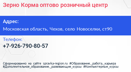 Зерно & Корма, оптово-розничный центр по адресу Московская область, Чехов, село Новоселки, ст90 в дальнейшем Организация, размещена в следующих категориях: