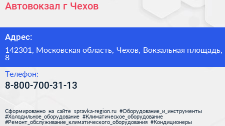 Автовокзал, г. Чехов по адресу 142301, Московская область, Чехов, Вокзальная площадь, 8 в дальнейшем Организация, размещена в следующих категориях:
