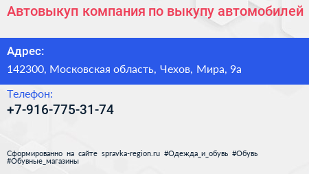 Автовыкуп, компания по выкупу автомобилей по адресу 142300, Московская область, Чехов, Мира, 9а в дальнейшем Организация, размещена в следующих категориях: