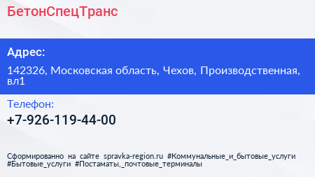 БетонСпецТранс по адресу 142326, Московская область, Чехов, Производственная, вл1 в дальнейшем Организация, размещена в следующих категориях: