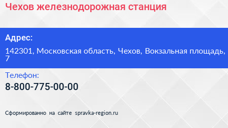 Чехов, железнодорожная станция по адресу 142301, Московская область, Чехов, Вокзальная площадь, 7 в дальнейшем Организация, размещена в следующих категориях: