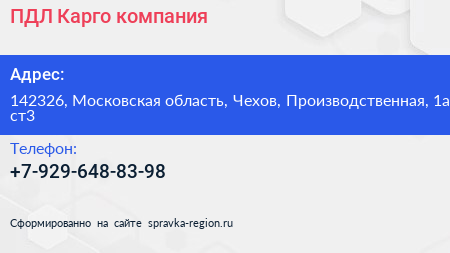 ПДЛ Карго, компания по адресу 142326, Московская область, Чехов, Производственная, 1а ст3 в дальнейшем Организация, размещена в следующих категориях: