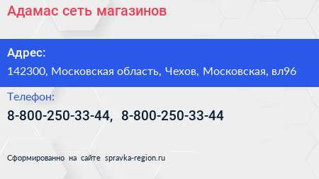 Адамас, сеть магазинов по адресу 142300, Московская область, Чехов, Московская, вл96 в дальнейшем Организация, размещена в следующих категориях: