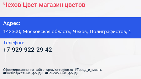 Чехов-Цвет, магазин цветов по адресу 142300, Московская область, Чехов, Полиграфистов, 1 в дальнейшем Организация, размещена в следующих категориях: