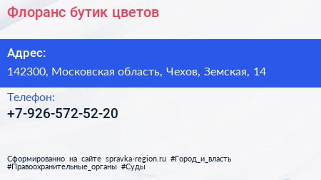 Флоранс, бутик цветов по адресу 142300, Московская область, Чехов, Земская, 14 в дальнейшем Организация, размещена в следующих категориях: