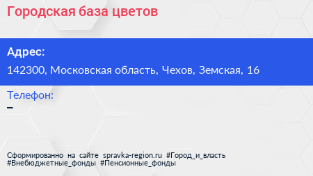 Городская база цветов по адресу 142300, Московская область, Чехов, Земская, 16 в дальнейшем Организация, размещена в следующих категориях: