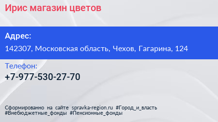 Ирис, магазин цветов по адресу 142307, Московская область, Чехов, Гагарина, 124 в дальнейшем Организация, размещена в следующих категориях: