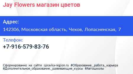 Jay Flowers, магазин цветов по адресу 142306, Московская область, Чехов, Лопасненская, 7 в дальнейшем Организация, размещена в следующих категориях: