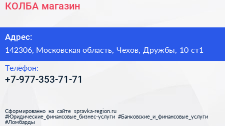КОЛБА, магазин по адресу 142306, Московская область, Чехов, Дружбы, 10 ст1 в дальнейшем Организация, размещена в следующих категориях: