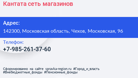 Кантата, сеть магазинов по адресу 142300, Московская область, Чехов, Московская, 96 в дальнейшем Организация, размещена в следующих категориях:
