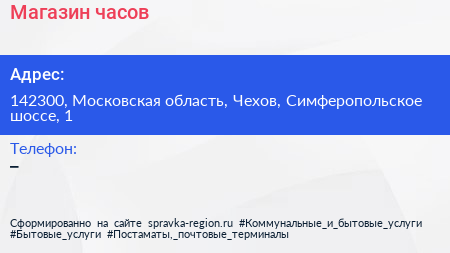 Магазин часов по адресу 142300, Московская область, Чехов, Симферопольское шоссе, 1 в дальнейшем Организация, размещена в следующих категориях: