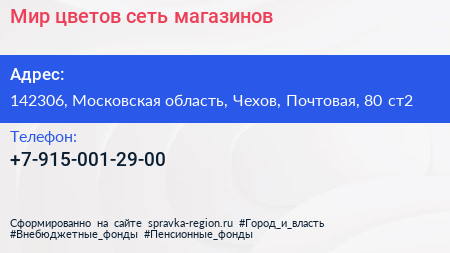 Мир цветов, сеть магазинов по адресу 142306, Московская область, Чехов, Почтовая, 80 ст2 в дальнейшем Организация, размещена в следующих категориях:
