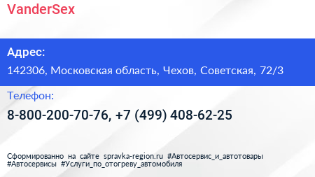 VanderSex по адресу 142306, Московская область, Чехов, Советская, 72/3 в дальнейшем Организация, размещена в следующих категориях: