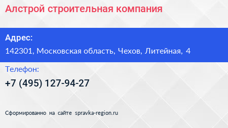 Алстрой, строительная компания по адресу 142301, Московская область, Чехов, Литейная, 4 в дальнейшем Организация, размещена в следующих категориях: