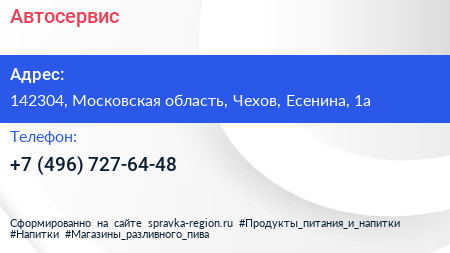 Автосервис по адресу 142304, Московская область, Чехов, Есенина, 1а в дальнейшем Организация, размещена в следующих категориях: