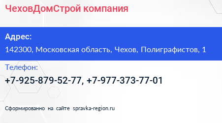 ЧеховДомСтрой, компания по адресу 142300, Московская область, Чехов, Полиграфистов, 1 в дальнейшем Организация, размещена в следующих категориях:
