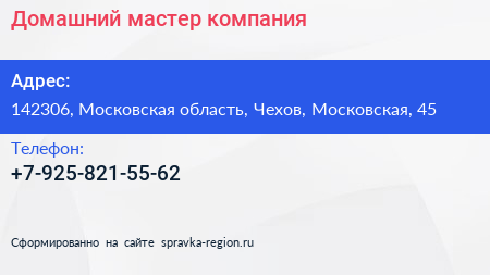 Домашний мастер, компания по адресу 142306, Московская область, Чехов, Московская, 45 в дальнейшем Организация, размещена в следующих категориях: