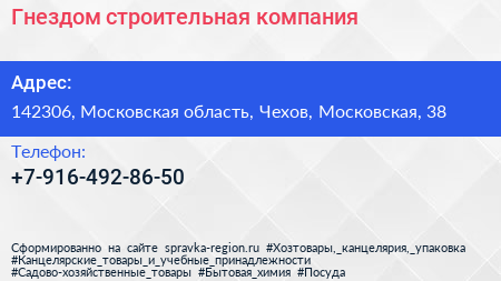 Гнездом, строительная компания по адресу 142306, Московская область, Чехов, Московская, 38 в дальнейшем Организация, размещена в следующих категориях: