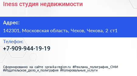 Iness, студия недвижимости по адресу 142301, Московская область, Чехов, Чехова, 2 ст1 в дальнейшем Организация, размещена в следующих категориях: