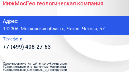 ИнжМосГео, геологическая компания по адресу 142306, Московская область, Чехов, Чехова, 67 в дальнейшем Организация, размещена в следующих категориях: