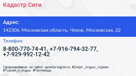 Кадастр-Сити по адресу 142306, Московская область, Чехов, Московская, 22 в дальнейшем Организация, размещена в следующих категориях: