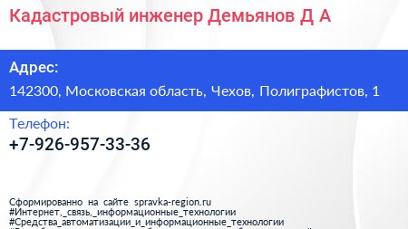 Кадастровый инженер Демьянов Д.А. по адресу 142300, Московская область, Чехов, Полиграфистов, 1 в дальнейшем Организация, размещена в следующих категориях: