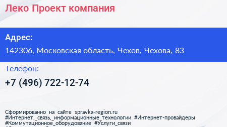 Леко-Проект, компания по адресу 142306, Московская область, Чехов, Чехова, 83 в дальнейшем Организация, размещена в следующих категориях: