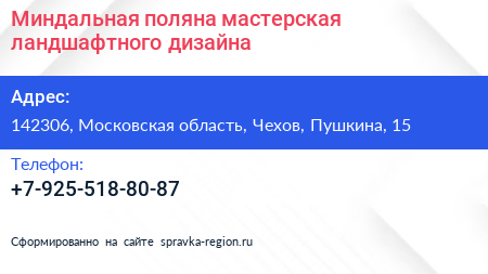 Миндальная поляна, мастерская ландшафтного дизайна по адресу 142306, Московская область, Чехов, Пушкина, 15 в дальнейшем Организация, размещена в следующих категориях: