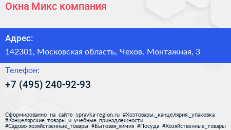 Окна Микс, компания по адресу 142301, Московская область, Чехов, Монтажная, 3 в дальнейшем Организация, размещена в следующих категориях: