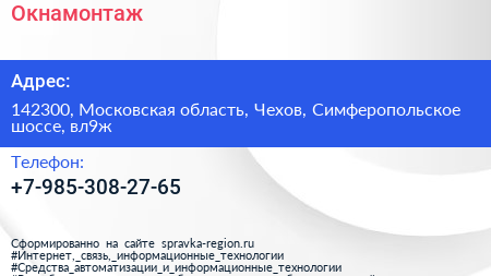 Окнамонтаж по адресу 142300, Московская область, Чехов, Симферопольское шоссе, вл9ж в дальнейшем Организация, размещена в следующих категориях: