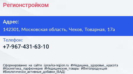 Регионстройком по адресу 142301, Московская область, Чехов, Товарная, 17а в дальнейшем Организация, размещена в следующих категориях: