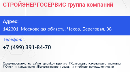 СТРОЙЭНЕРГОСЕРВИС, группа компаний по адресу 142301, Московская область, Чехов, Береговая, 38 в дальнейшем Организация, размещена в следующих категориях: