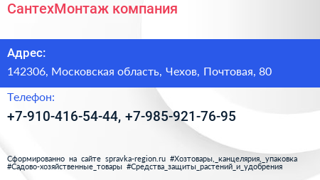СантехМонтаж, компания по адресу 142306, Московская область, Чехов, Почтовая, 80 в дальнейшем Организация, размещена в следующих категориях: