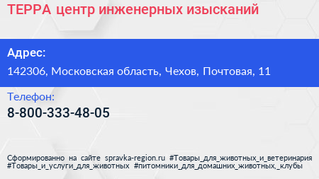 ТЕРРА, центр инженерных изысканий по адресу 142306, Московская область, Чехов, Почтовая, 11 в дальнейшем Организация, размещена в следующих категориях: