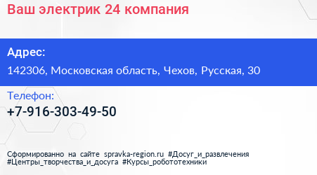 Ваш электрик 24, компания по адресу 142306, Московская область, Чехов, Русская, 30 в дальнейшем Организация, размещена в следующих категориях: