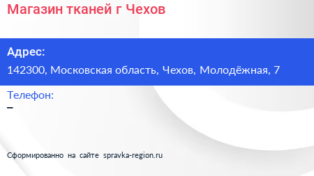 Магазин тканей, г. Чехов по адресу 142300, Московская область, Чехов, Молодёжная, 7 в дальнейшем Организация, размещена в следующих категориях: