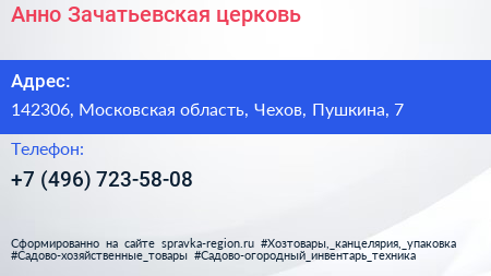 Анно-Зачатьевская церковь по адресу 142306, Московская область, Чехов, Пушкина, 7 в дальнейшем Организация, размещена в следующих категориях: