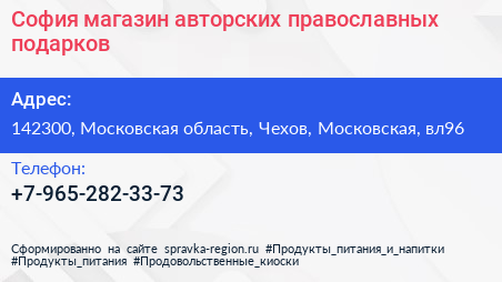София, магазин авторских православных подарков по адресу 142300, Московская область, Чехов, Московская, вл96 в дальнейшем Организация, размещена в следующих категориях:
