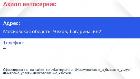 Ахилл, автосервис по адресу Московская область, Чехов, Гагарина, вл2 в дальнейшем Организация, размещена в следующих категориях: