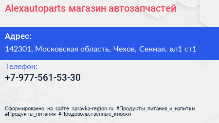 Alexautoparts, магазин автозапчастей по адресу 142301, Московская область, Чехов, Сенная, вл1 ст1 в дальнейшем Организация, размещена в следующих категориях: