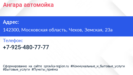 Ангара, автомойка по адресу 142300, Московская область, Чехов, Земская, 23а в дальнейшем Организация, размещена в следующих категориях:
