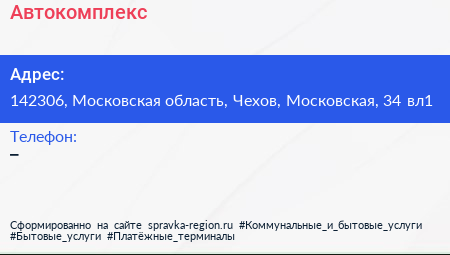 Автокомплекс по адресу 142306, Московская область, Чехов, Московская, 34 вл1 в дальнейшем Организация, размещена в следующих категориях: