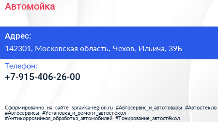 Автомойка по адресу 142301, Московская область, Чехов, Ильича, 39Б в дальнейшем Организация, размещена в следующих категориях: