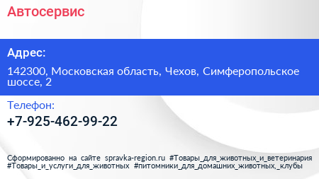 Автосервис по адресу 142300, Московская область, Чехов, Симферопольское шоссе, 2 в дальнейшем Организация, размещена в следующих категориях: