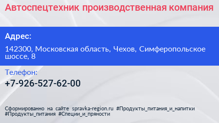 Автоспецтехник, производственная компания по адресу 142300, Московская область, Чехов, Симферопольское шоссе, 8 в дальнейшем Организация, размещена в следующих категориях: