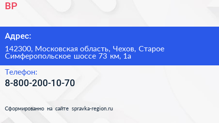 BP по адресу 142300, Московская область, Чехов, Старое Симферопольское шоссе 73 км, 1а в дальнейшем Организация, размещена в следующих категориях: