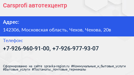 Carsprofi, автотехцентр по адресу 142306, Московская область, Чехов, Чехова, 20в в дальнейшем Организация, размещена в следующих категориях: