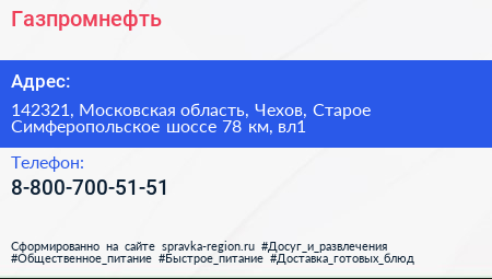 Газпромнефть по адресу 142321, Московская область, Чехов, Старое Симферопольское шоссе 78 км, вл1 в дальнейшем Организация, размещена в следующих категориях: