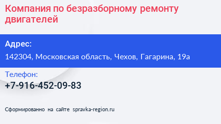 Компания по безразборному ремонту двигателей по адресу 142304, Московская область, Чехов, Гагарина, 19а в дальнейшем Организация, размещена в следующих категориях: